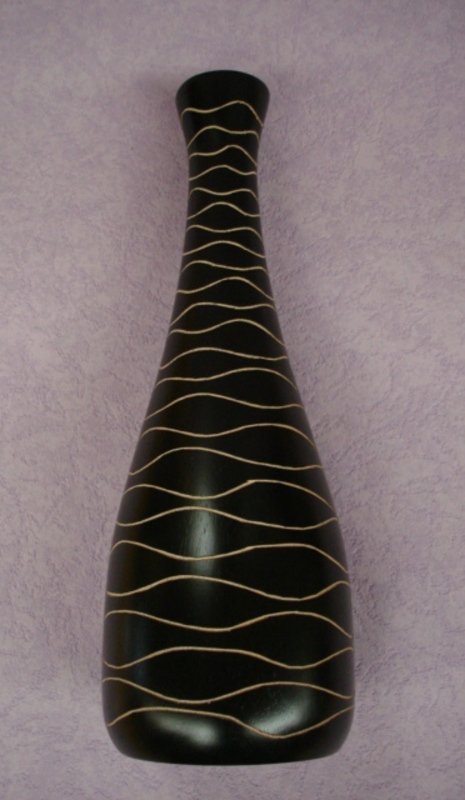 en bois de mangue, avec des segments, gravé: soleil (existe avec des figures différents, comme les vases bombés), ø 8 cm, hauteur: 31 cm